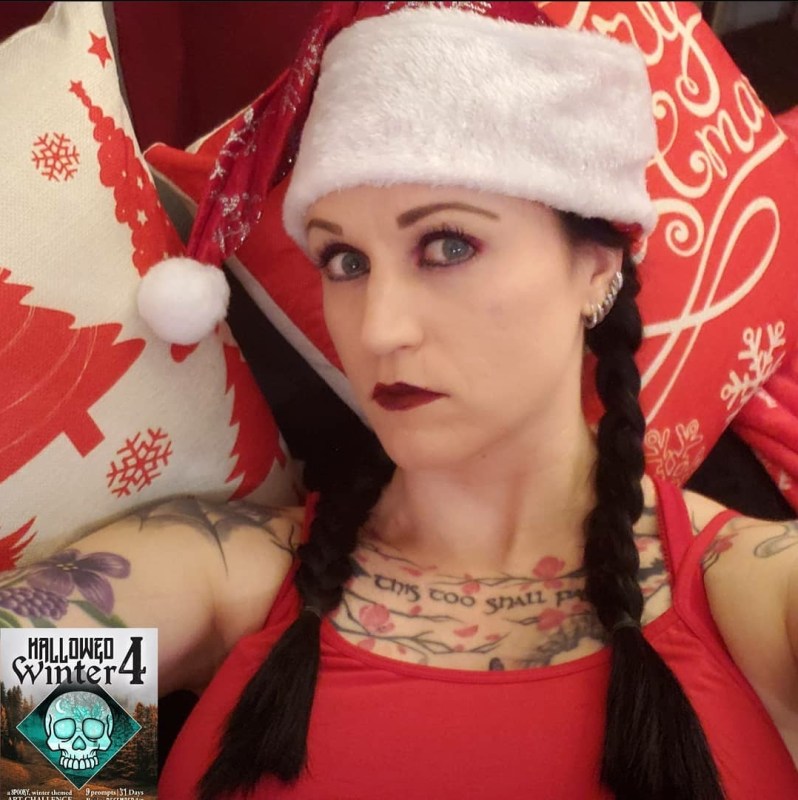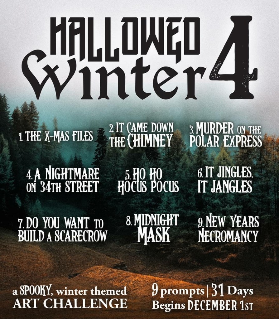Although this challenge, created and hosted by @hallowedwinter on Instagram, focuses on visual artists, I’m participating as a “literary artist.” The challenge provides nine prompts for works of art that cross Halloween and Christmas, to be completed between Dec. 1 and 31, 2020.