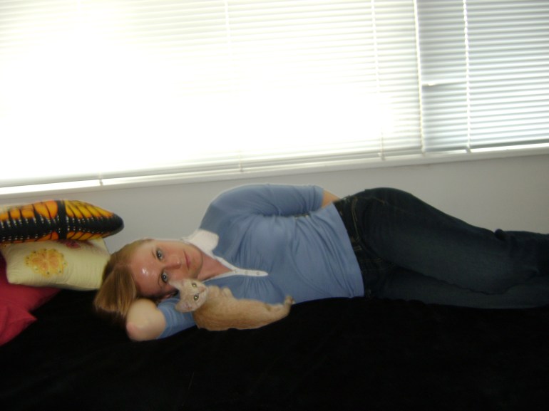 Lolita was also the first being I felt truly watched over and protected by. When I would cry, she would snuggle with me to comfort with me. When I was having a seizure aura, she would pace around me as I lay in bed or on the floor. She was always attentive to how I was doing at any moment – far more so than anyone would expect a cat to be. Her empathy was so deep that she even had to go on pain medication briefly in 2013 because her absorption of my high stress from work had made her unable to urinate. Extensive testing ruled out all physical explanations, leading the doctor to ask me whether I had been stressed as of late, and concluding that her empathy was the cause of her psychosomatic illness. She loved me sacrificially. And she was the first being in my life to care that much about both my physical and my emotional health.