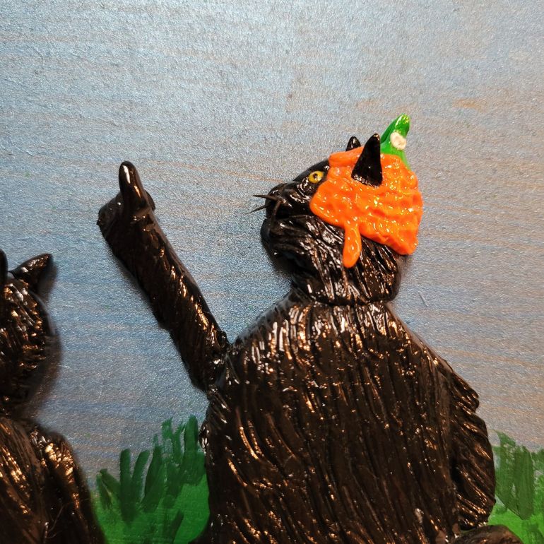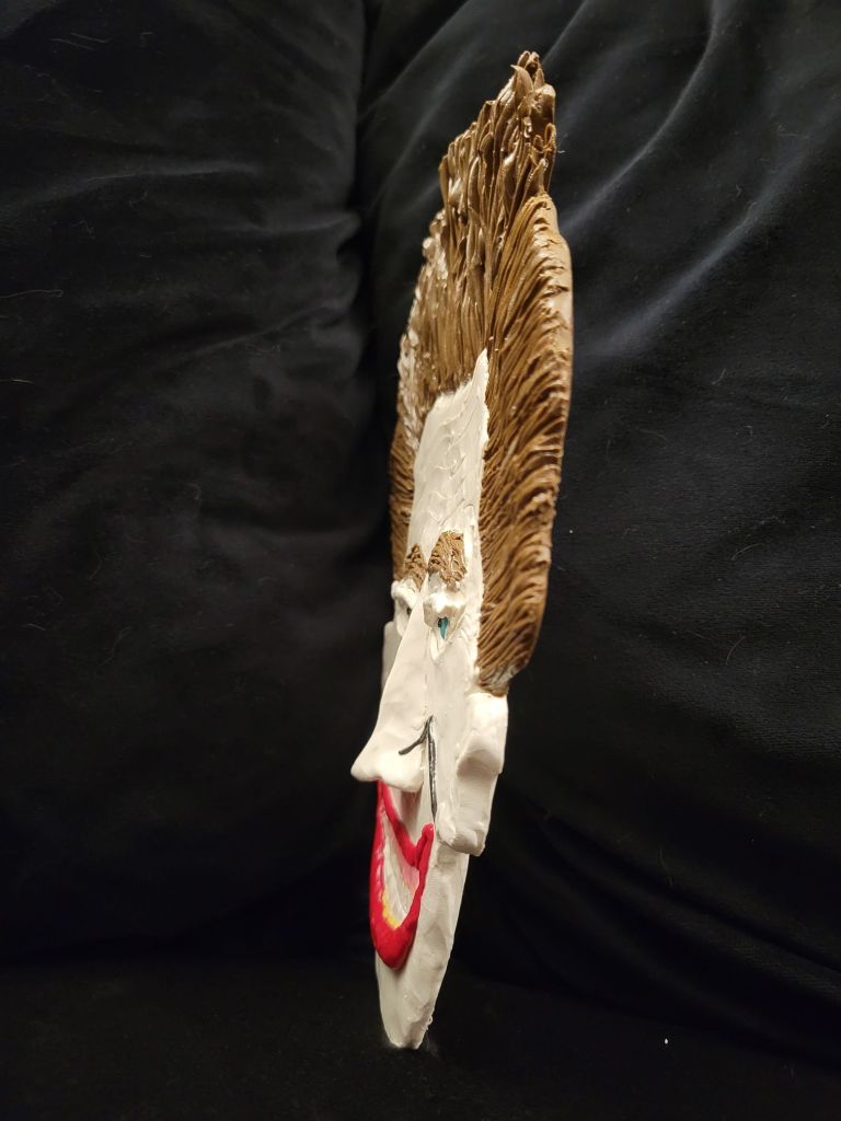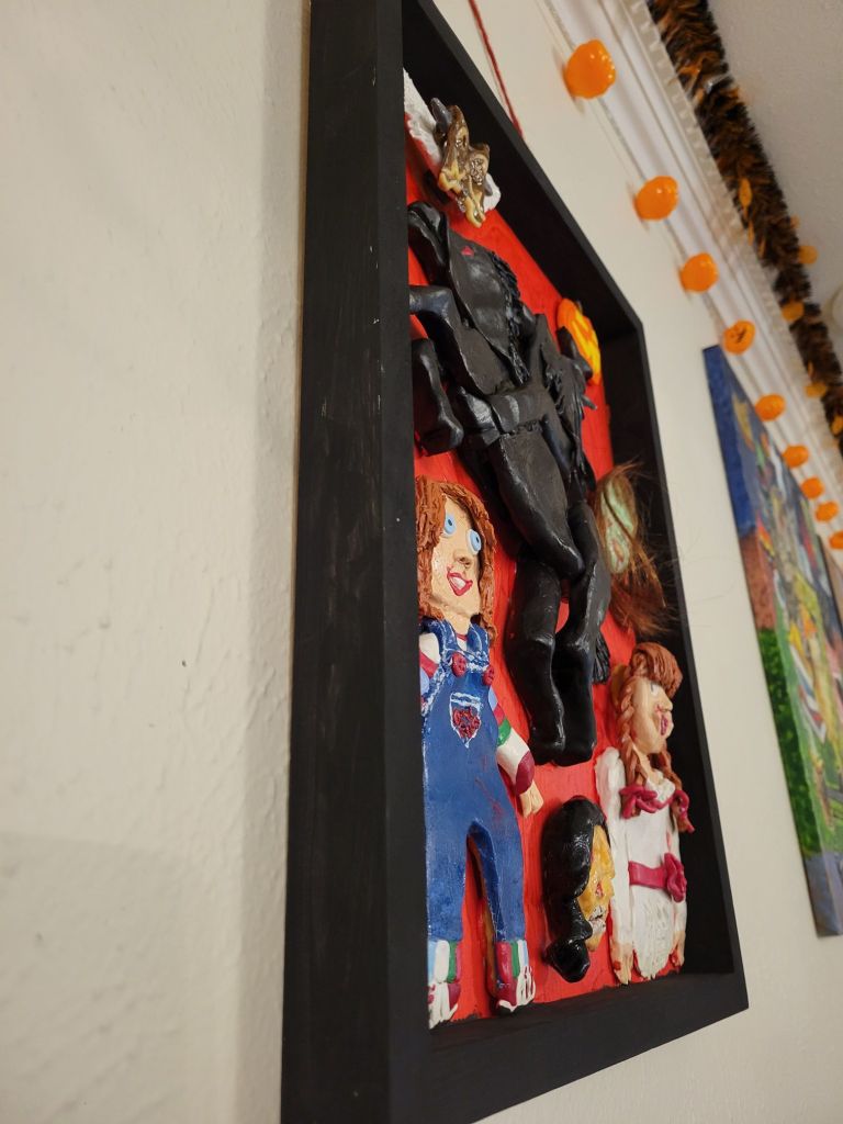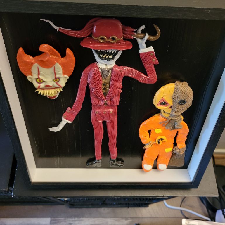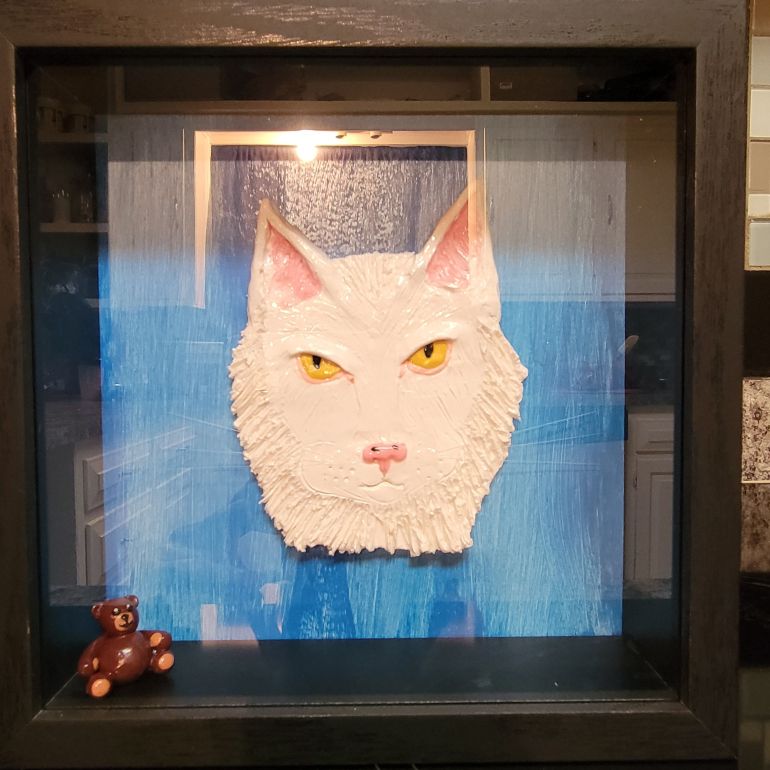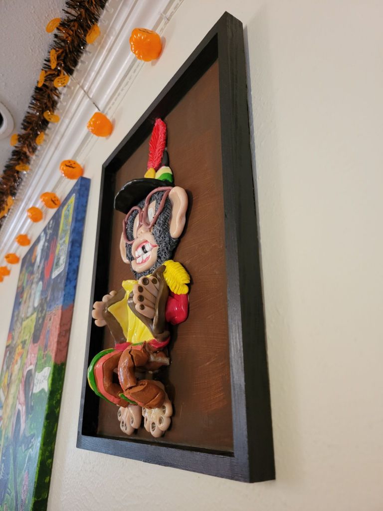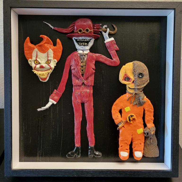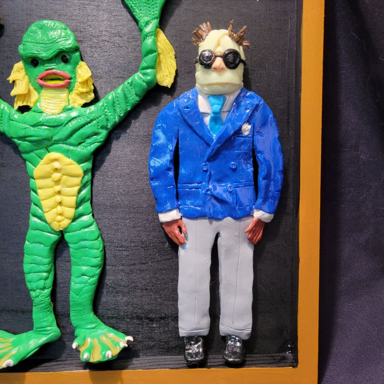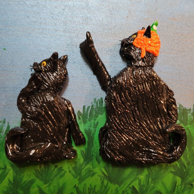 All sculptures were made by me with oven-bake polymer clay and sealed in a gloss or matte varnish. In some cases, I mounted them on my own acrylic-on-cardboard/unfinished wood paintings.