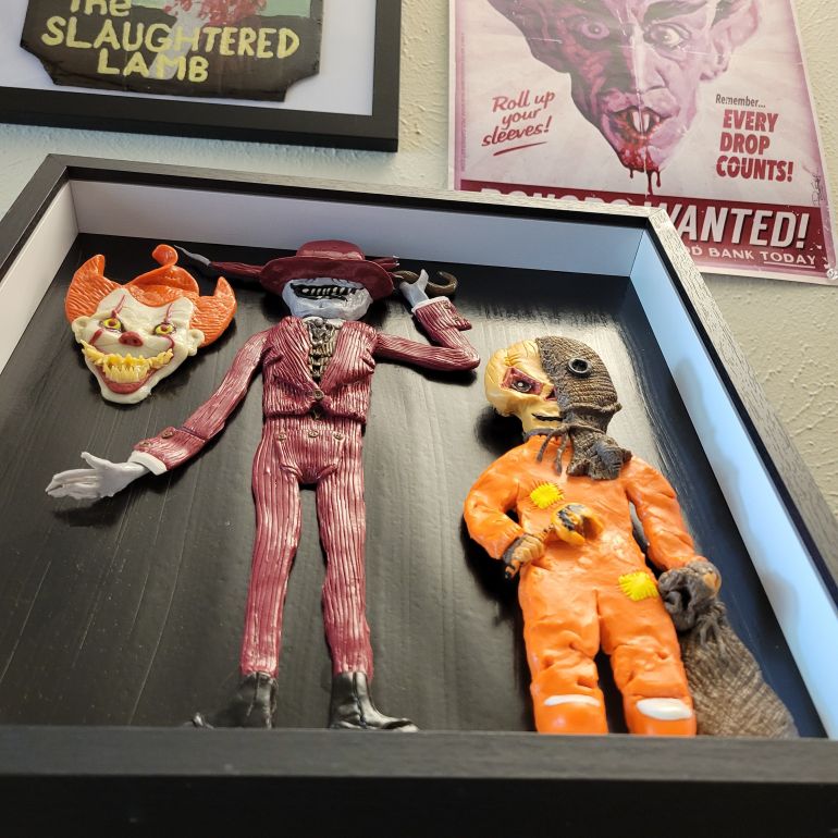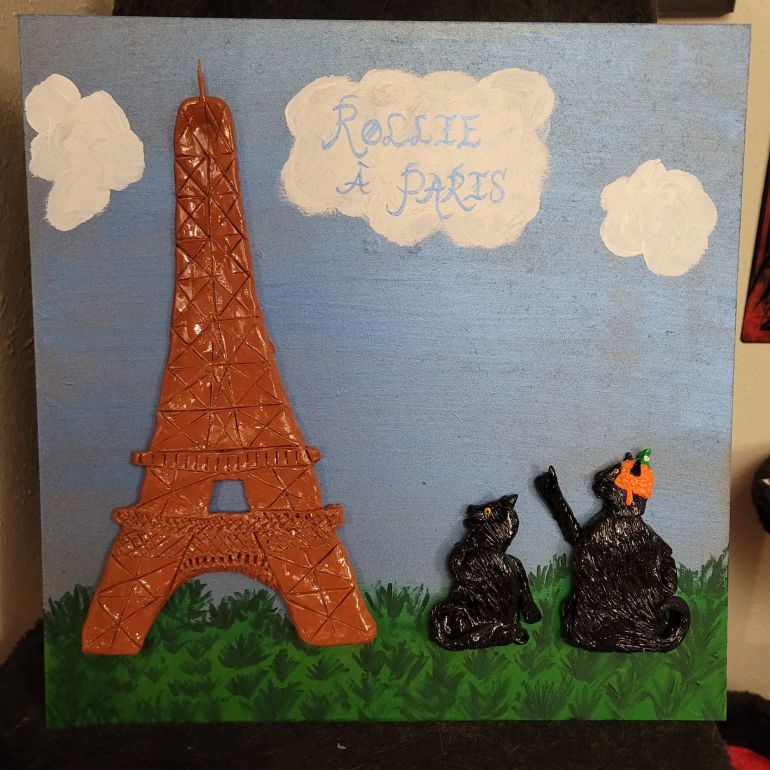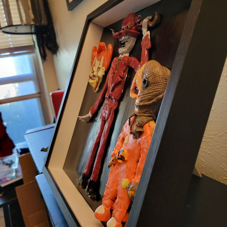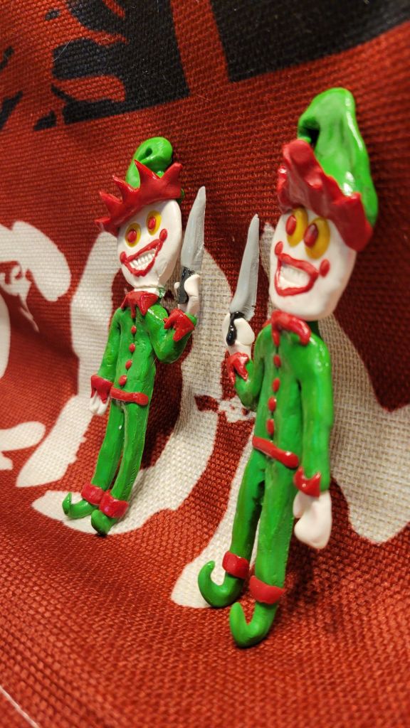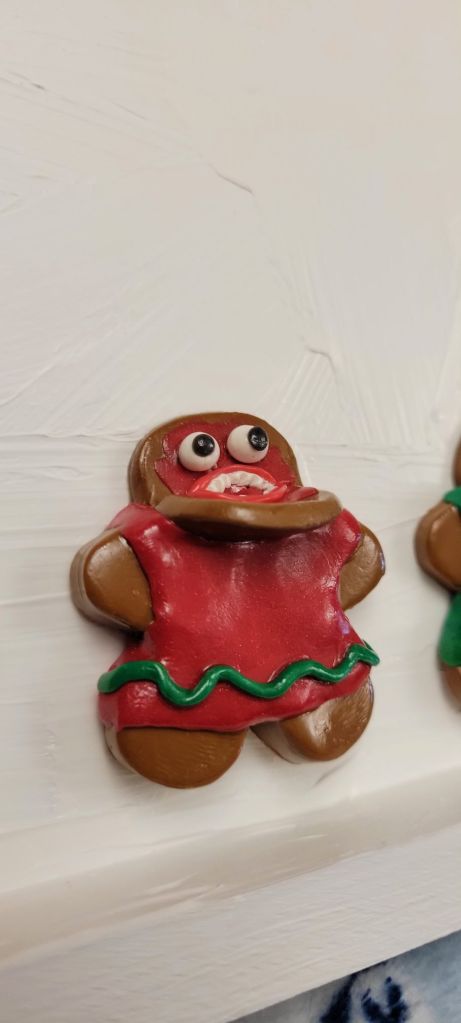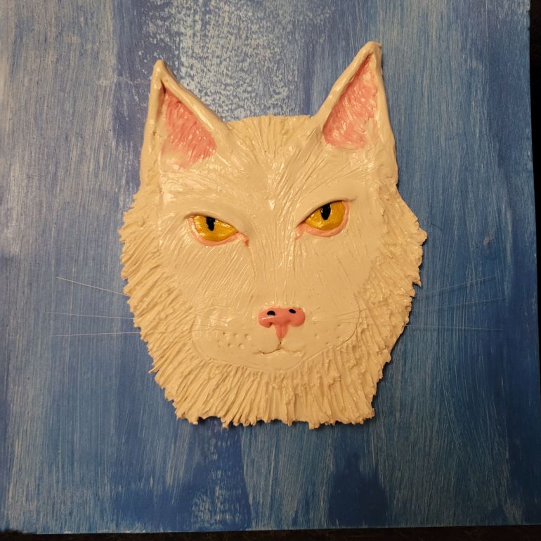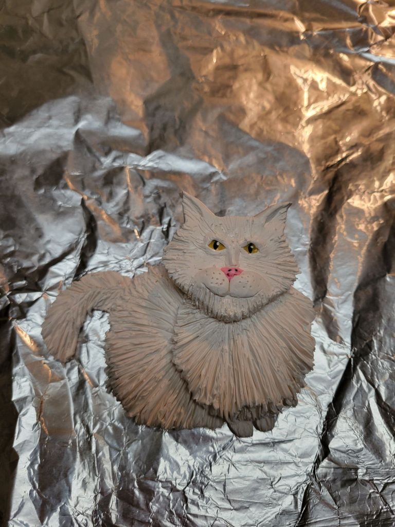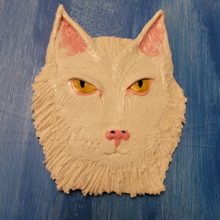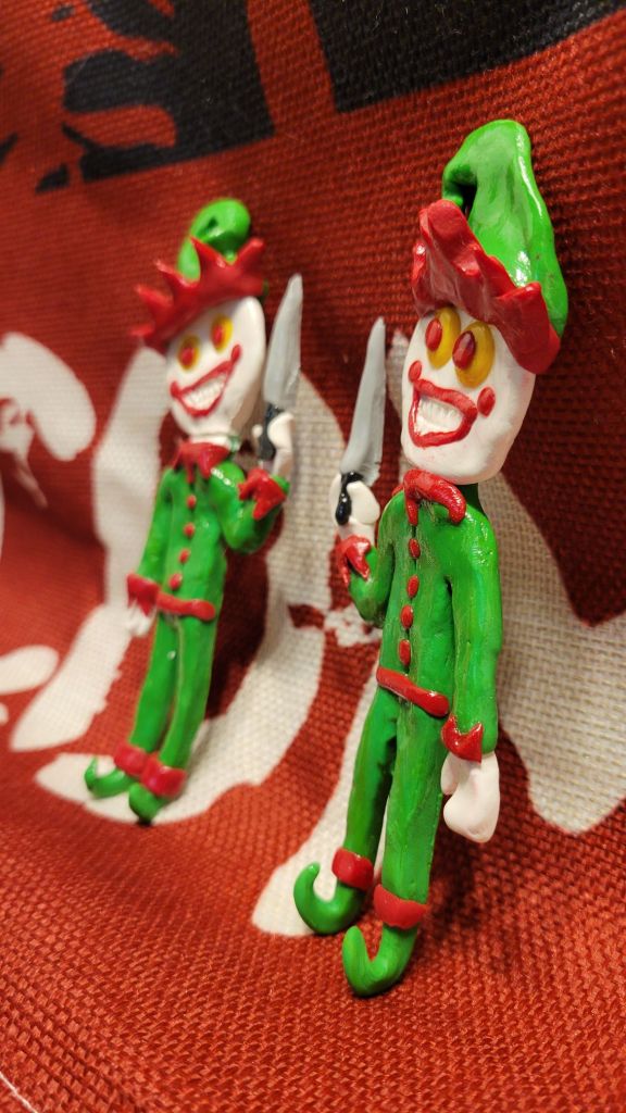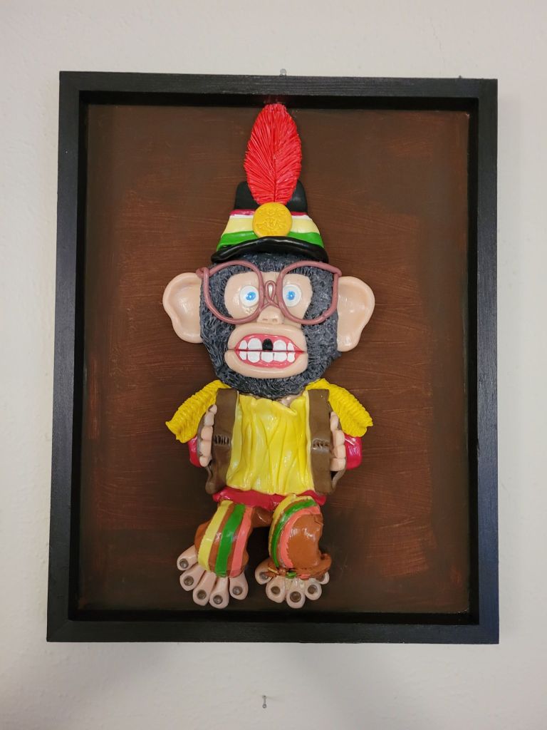 All sculptures were made by me with oven-bake polymer clay and sealed in a gloss or matte varnish. In some cases, I mounted them on my own acrylic-on-cardboard/unfinished wood paintings.