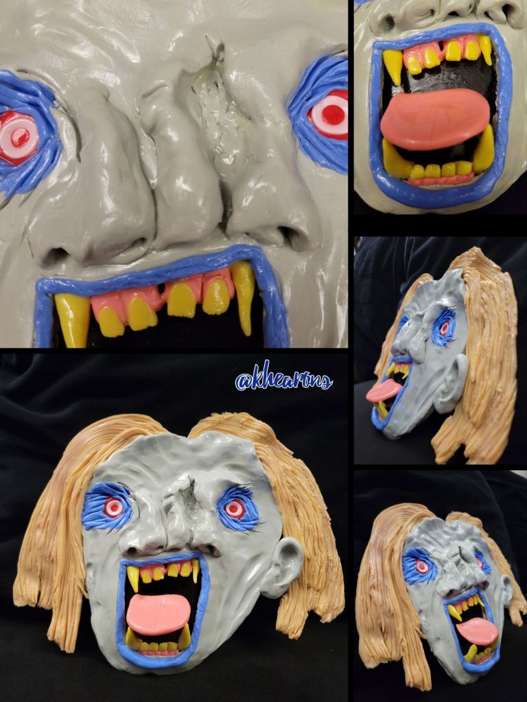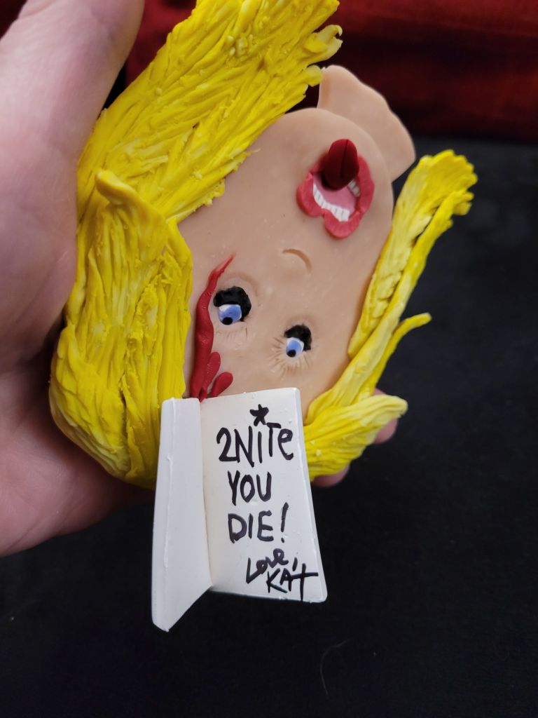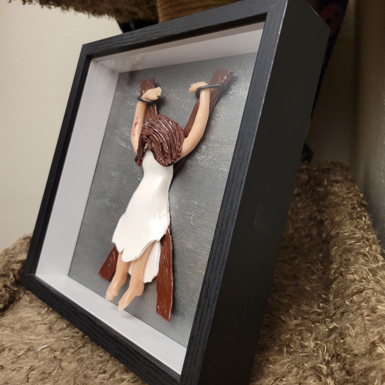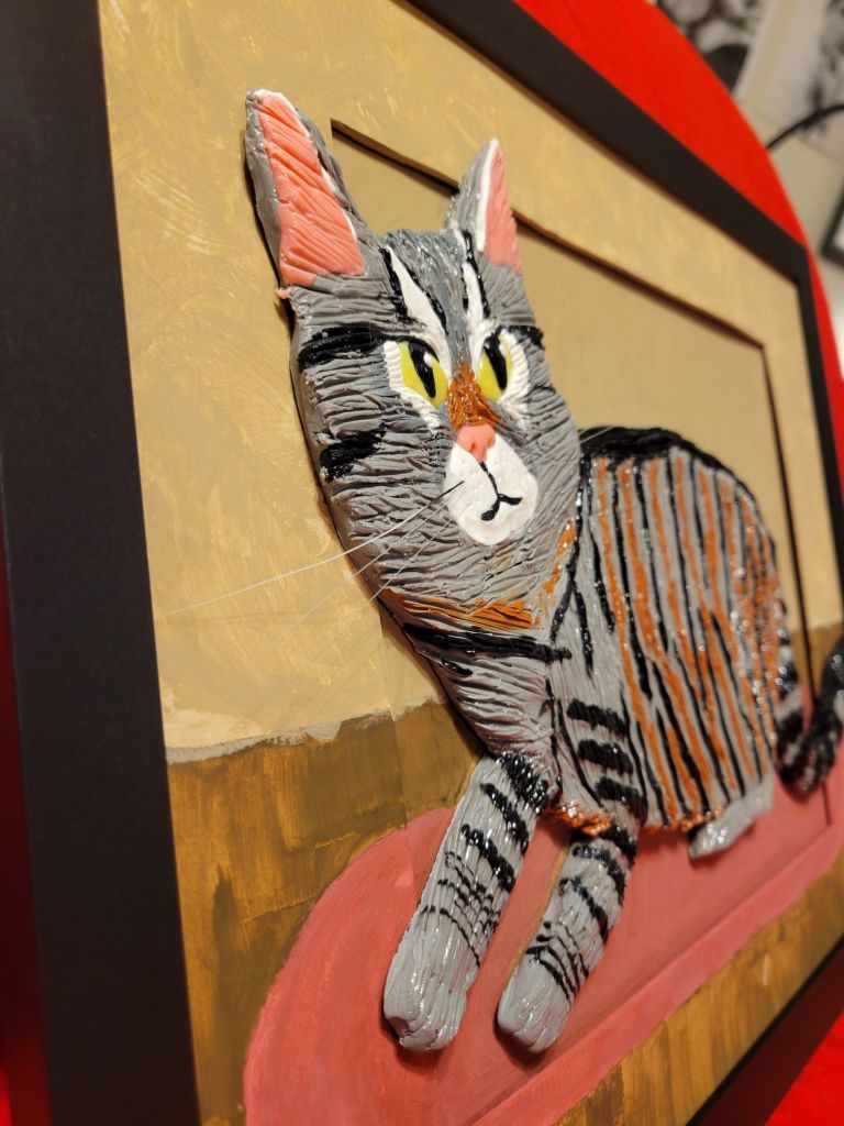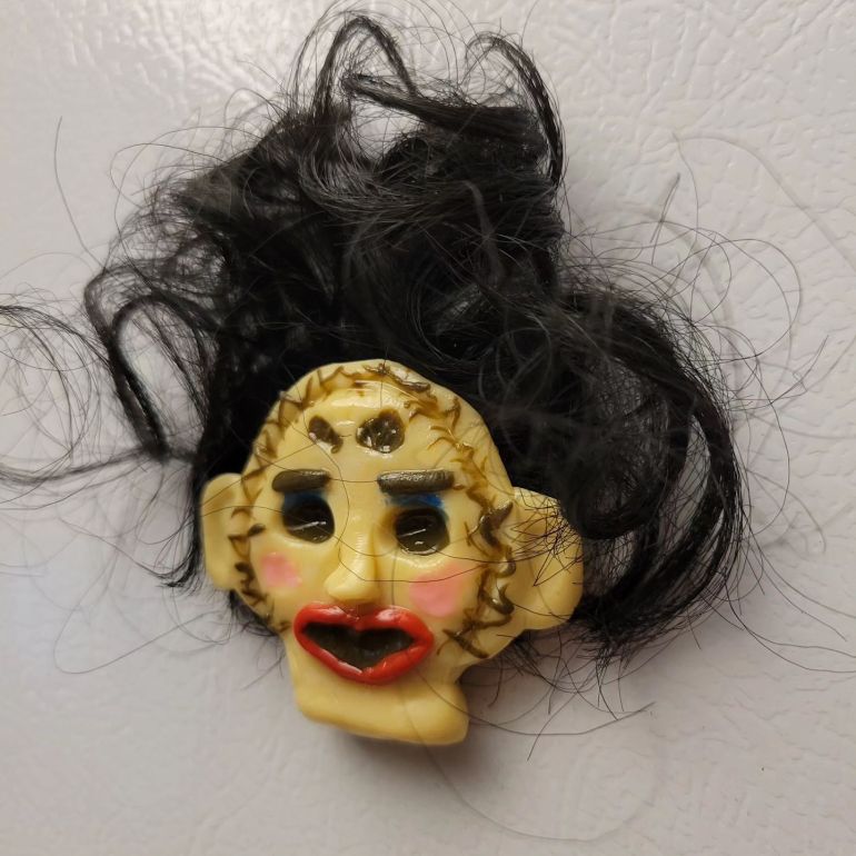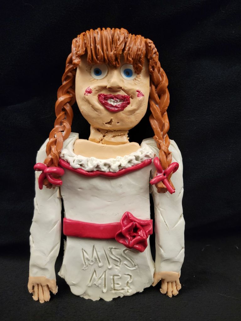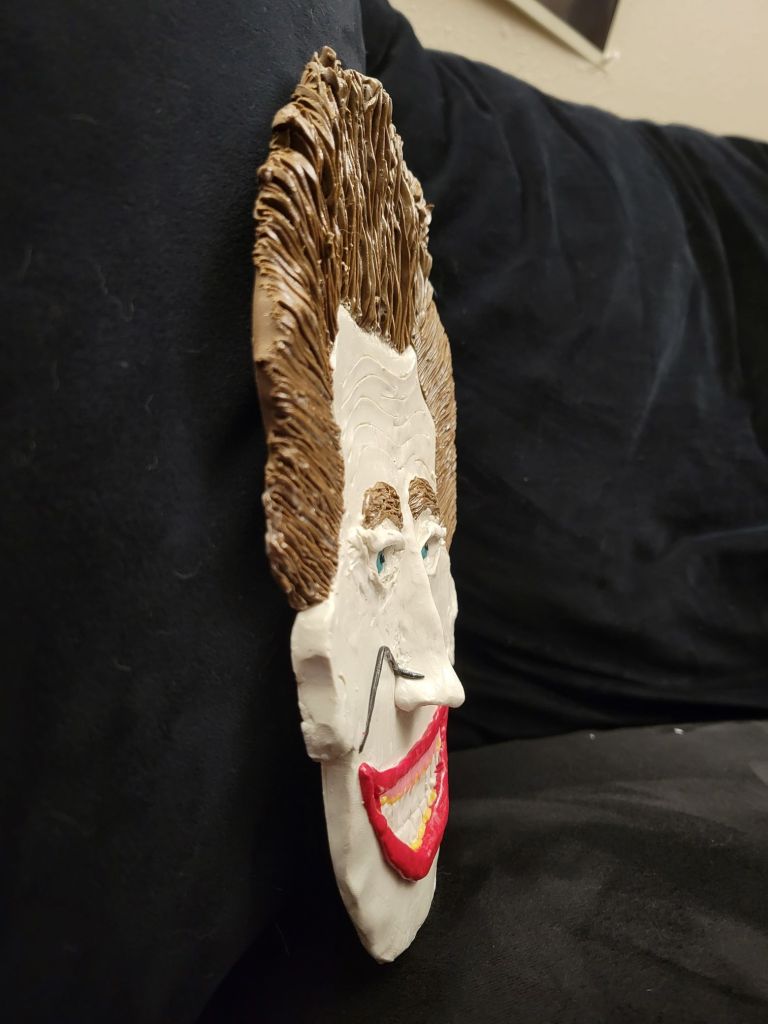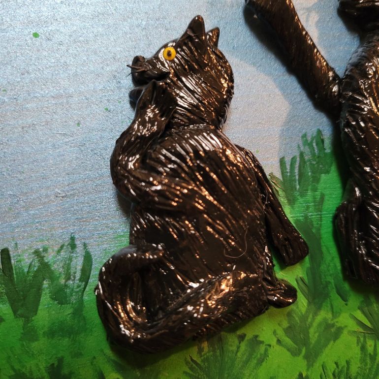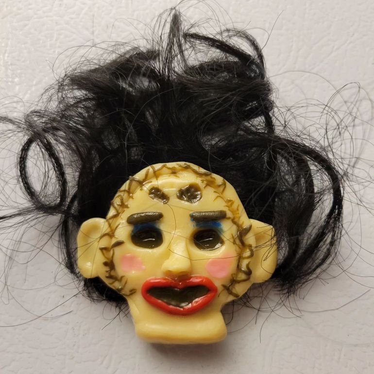 All sculptures were made by me with oven-bake polymer clay and sealed in a gloss or matte varnish. In some cases, I mounted them on my own acrylic-on-cardboard/unfinished wood paintings.