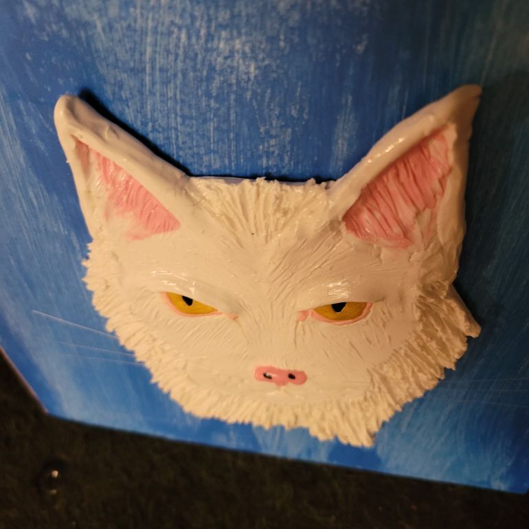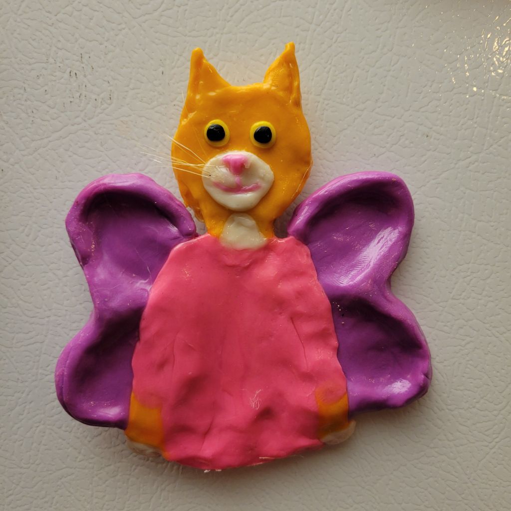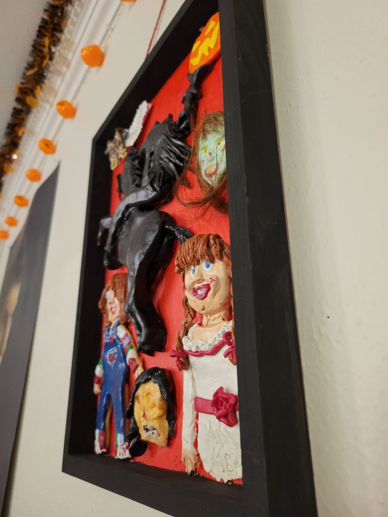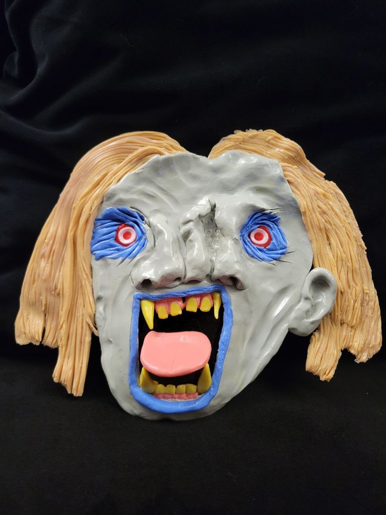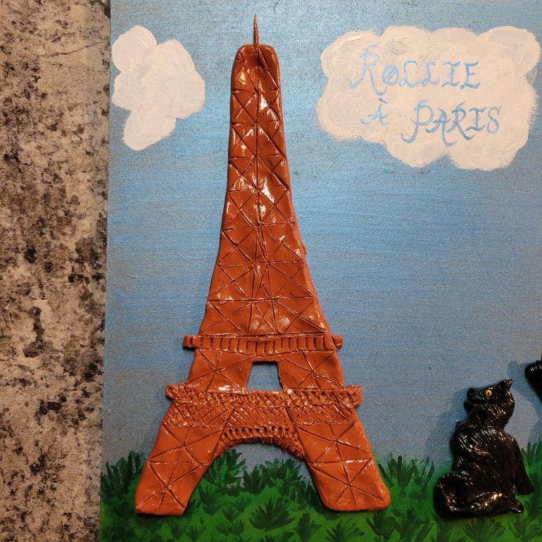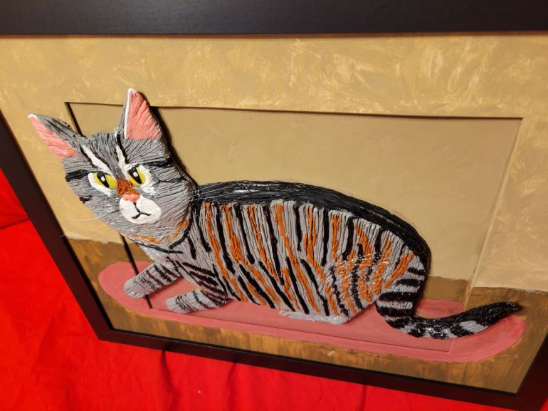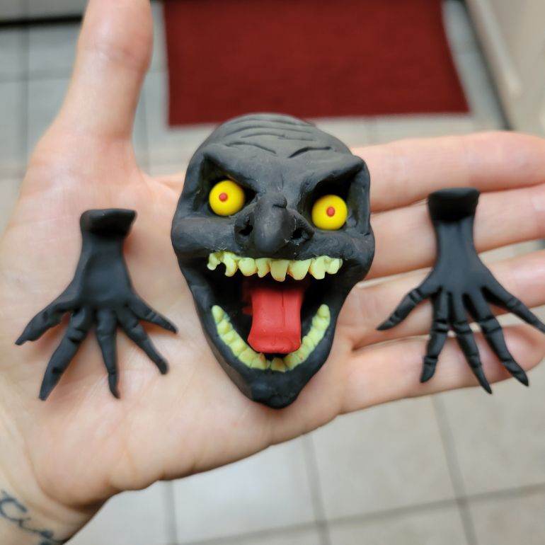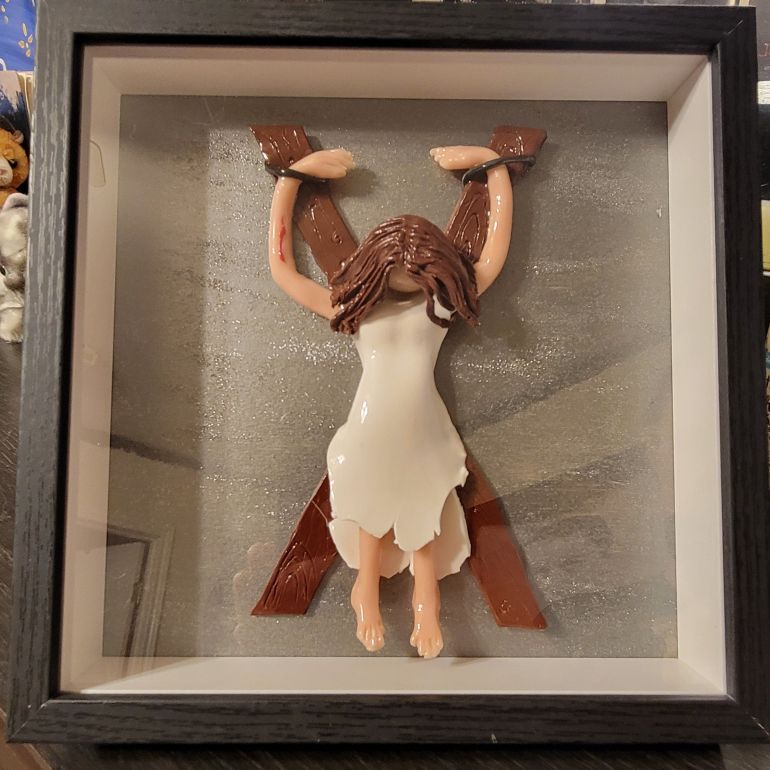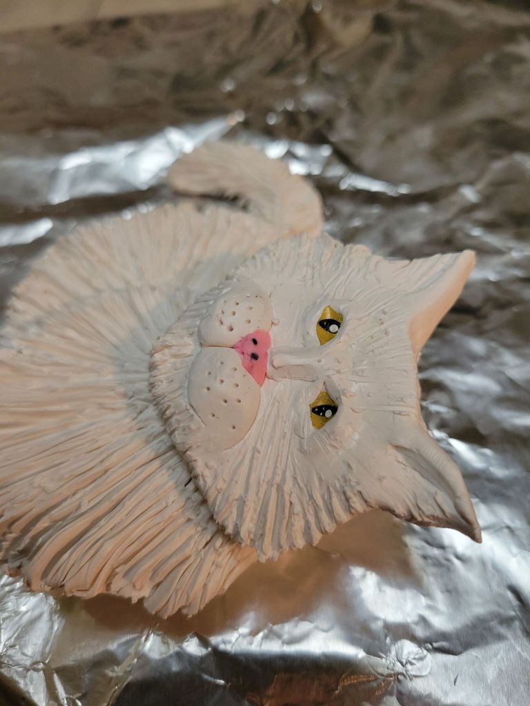 All sculptures were made by me with oven-bake polymer clay and sealed in a gloss or matte varnish. In some cases, I mounted them on my own acrylic-on-cardboard/unfinished wood paintings.