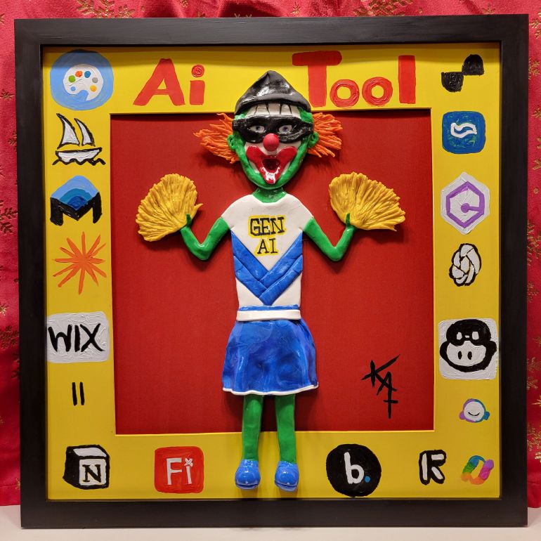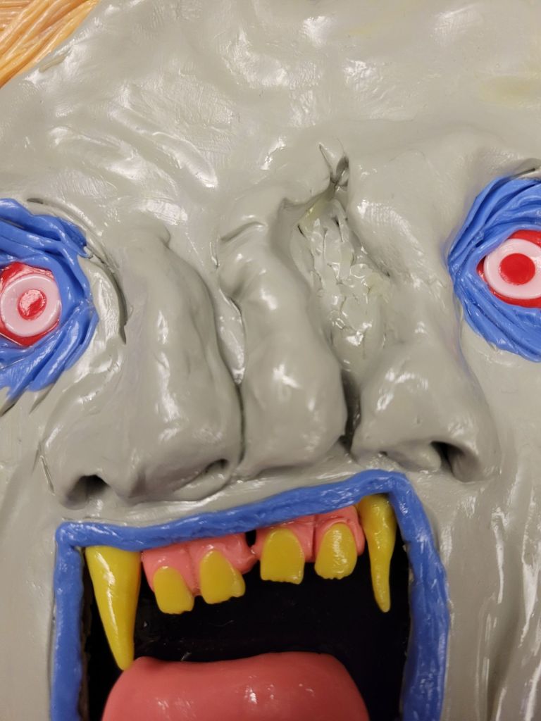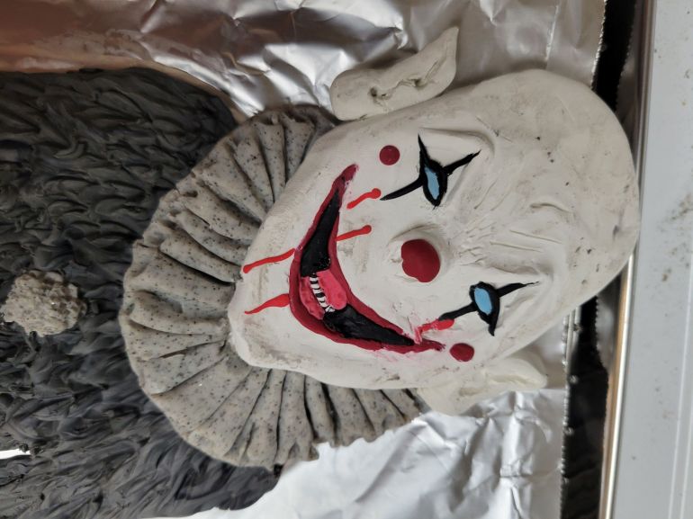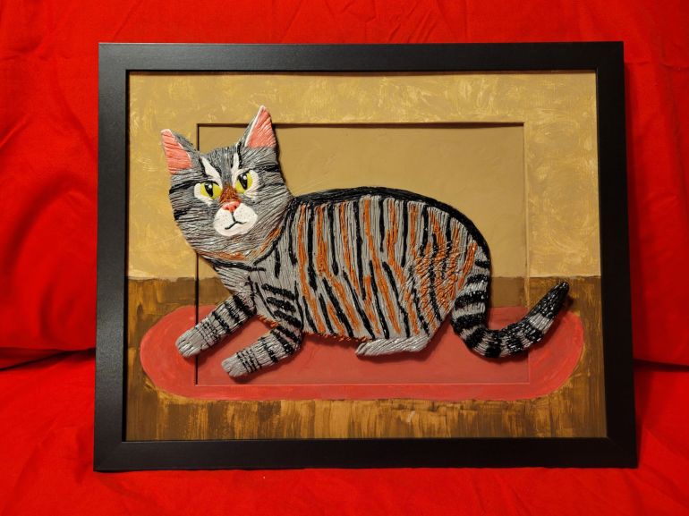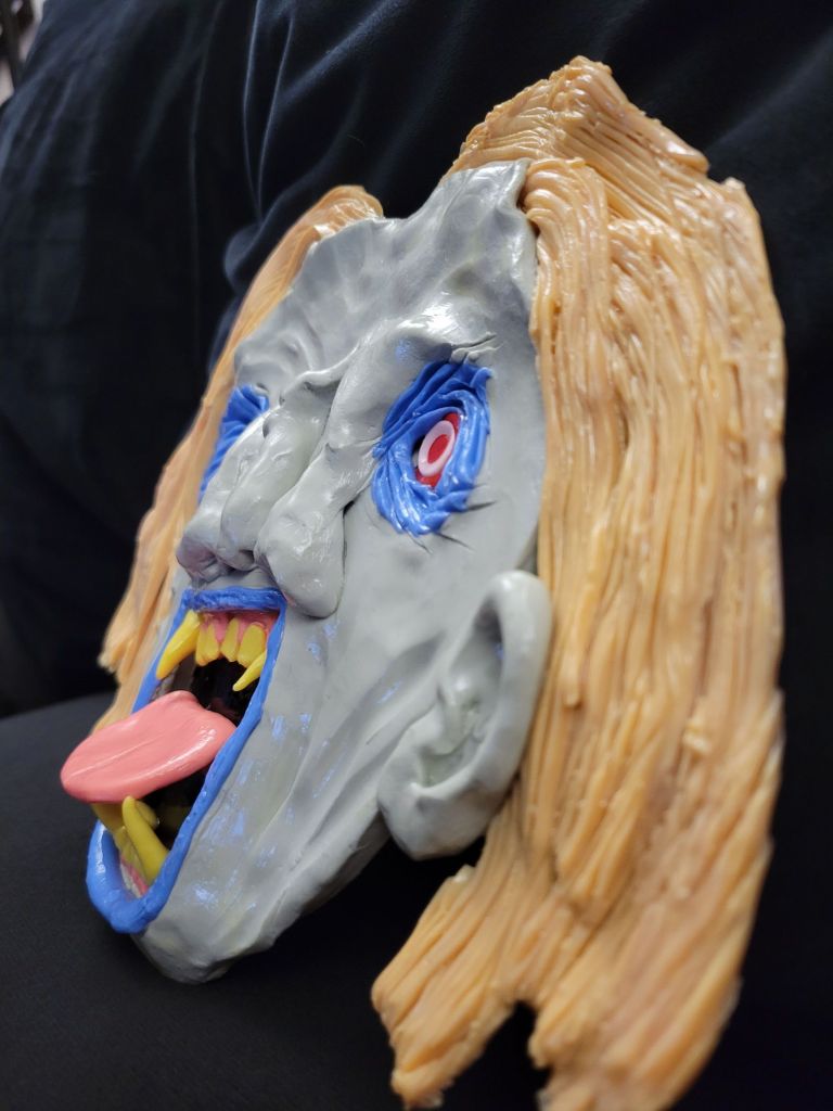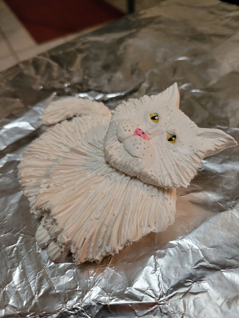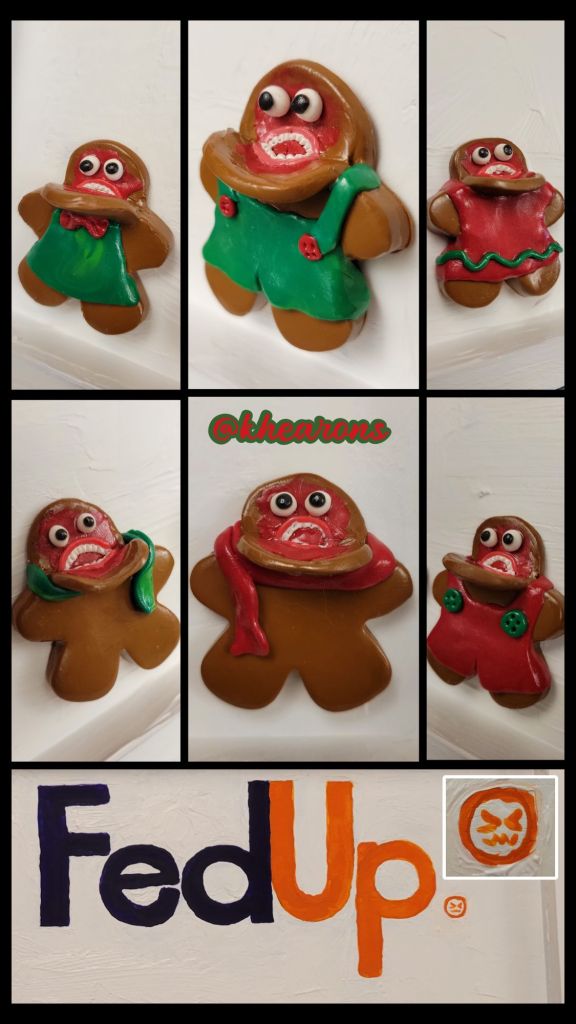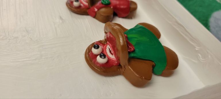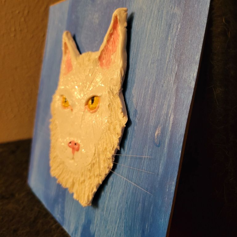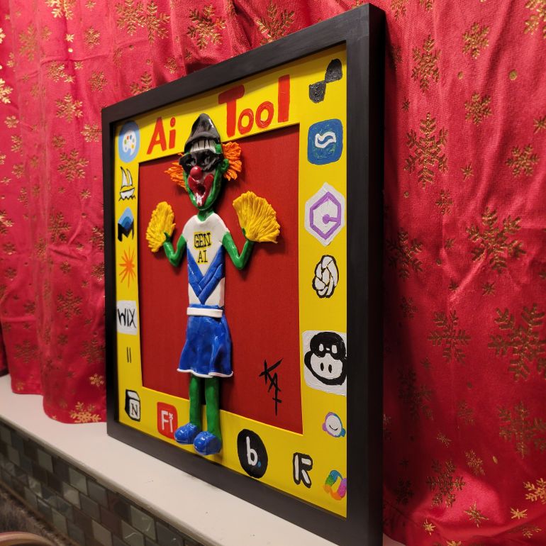 All sculptures were made by me with oven-bake polymer clay and sealed in a gloss or matte varnish. In some cases, I mounted them on my own acrylic-on-cardboard/unfinished wood paintings.