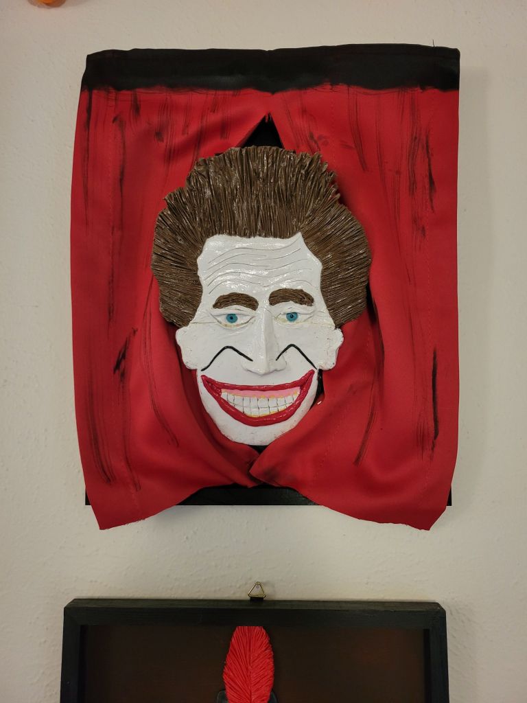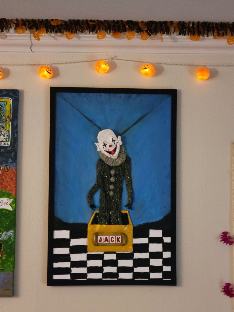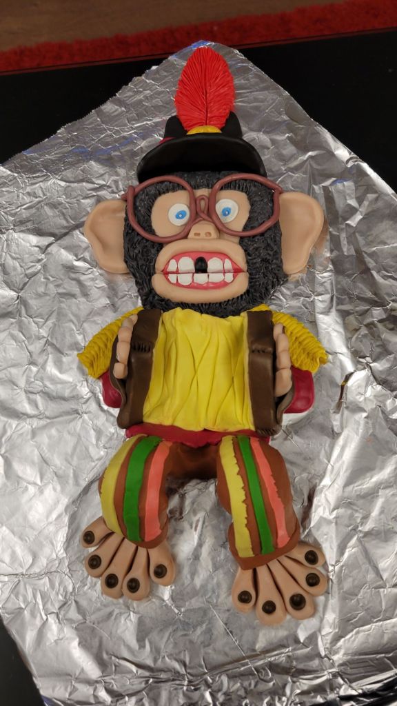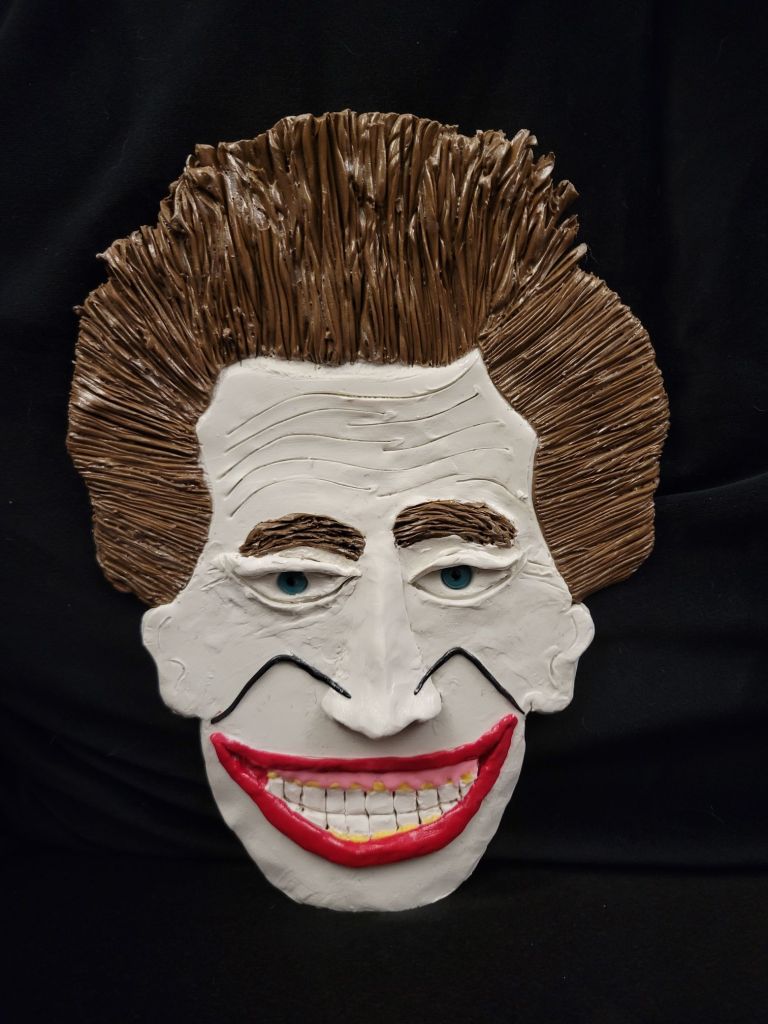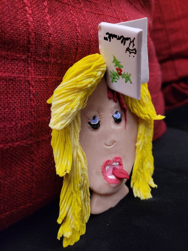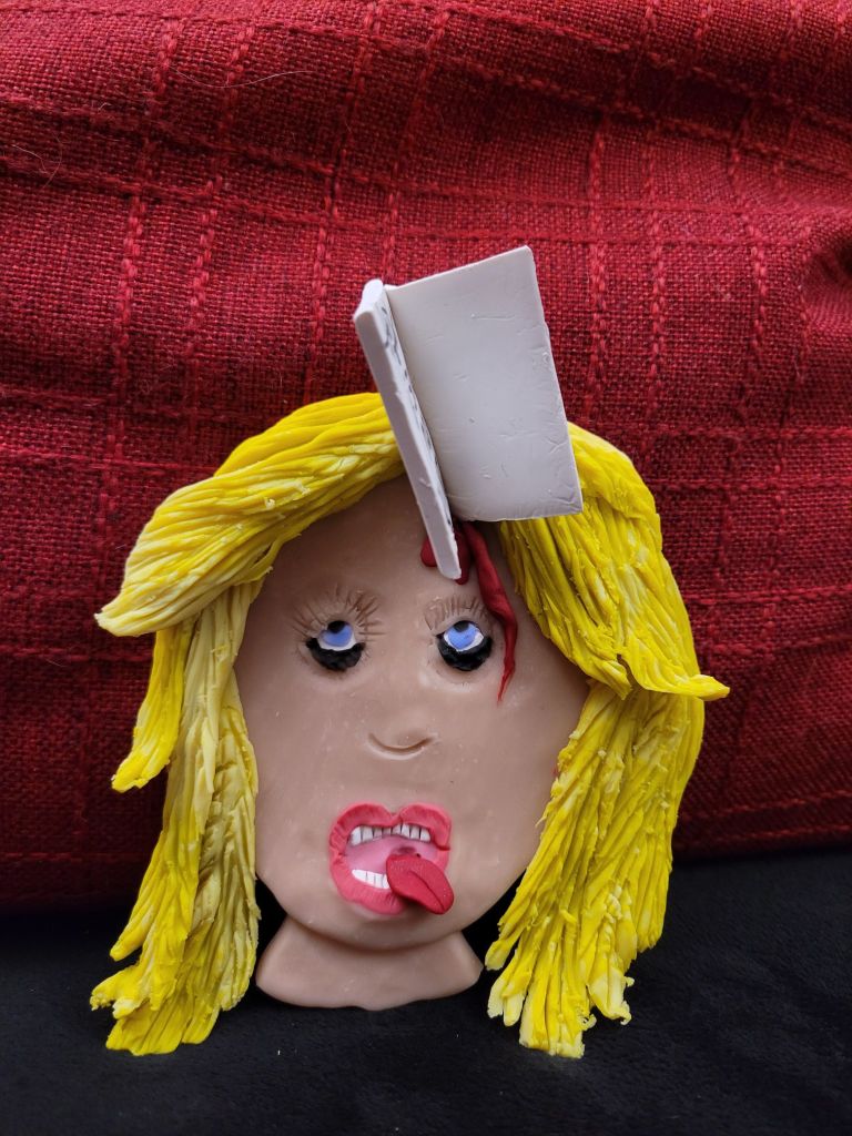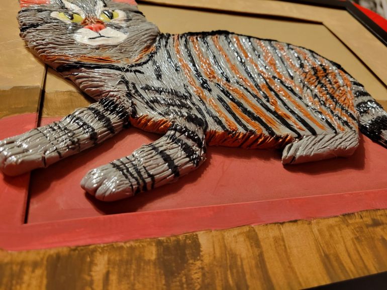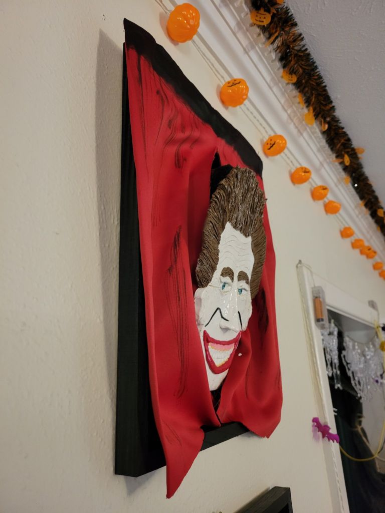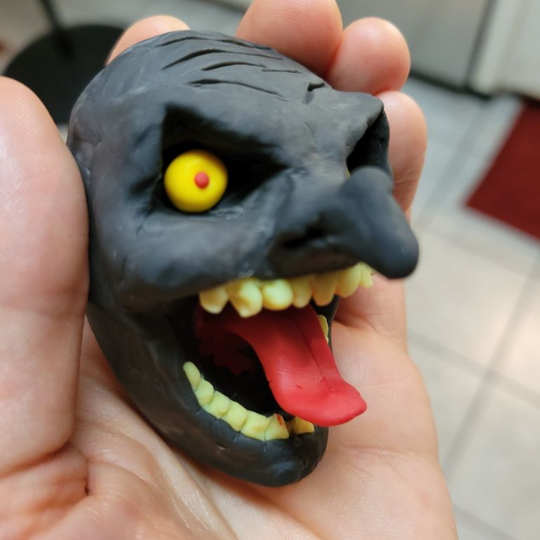 All sculptures were made by me with oven-bake polymer clay and sealed in a gloss or matte varnish. In some cases, I mounted them on my own acrylic-on-cardboard/unfinished wood paintings.