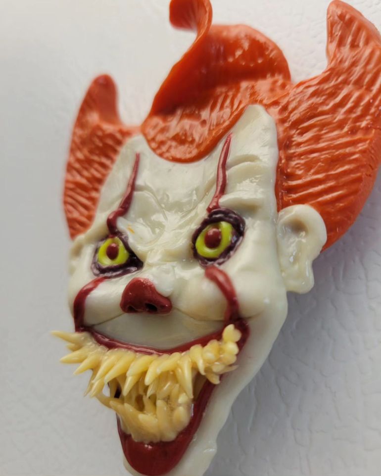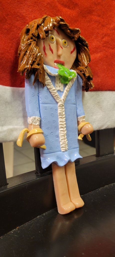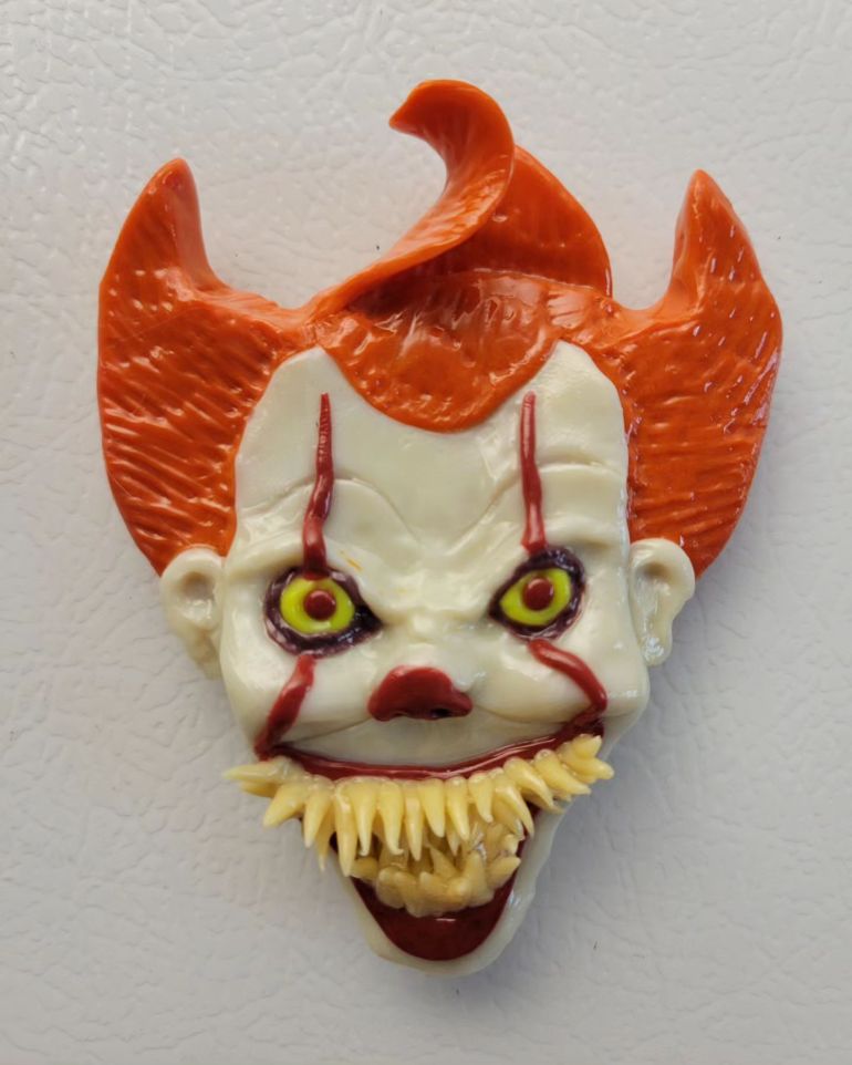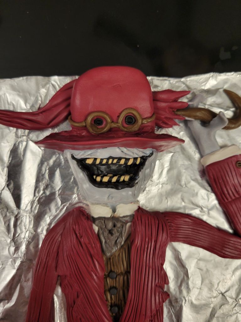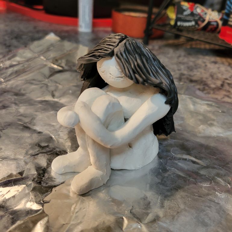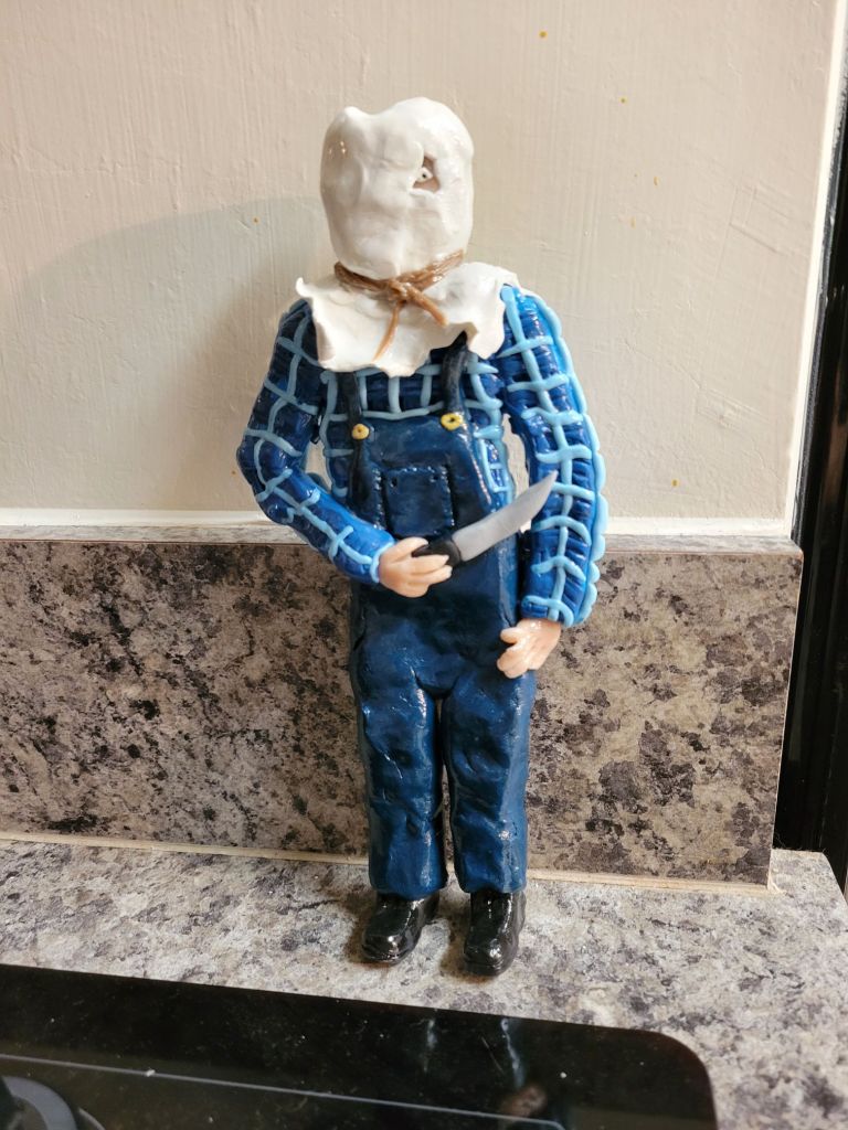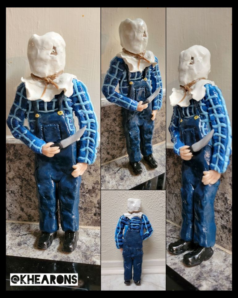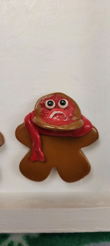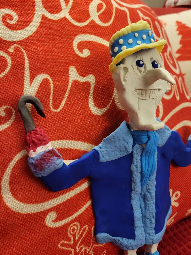All sculptures were made by me with oven-bake polymer clay and sealed in a gloss or matte varnish. In some cases, I mounted them on my own acrylic-on-cardboard/unfinished wood paintings.