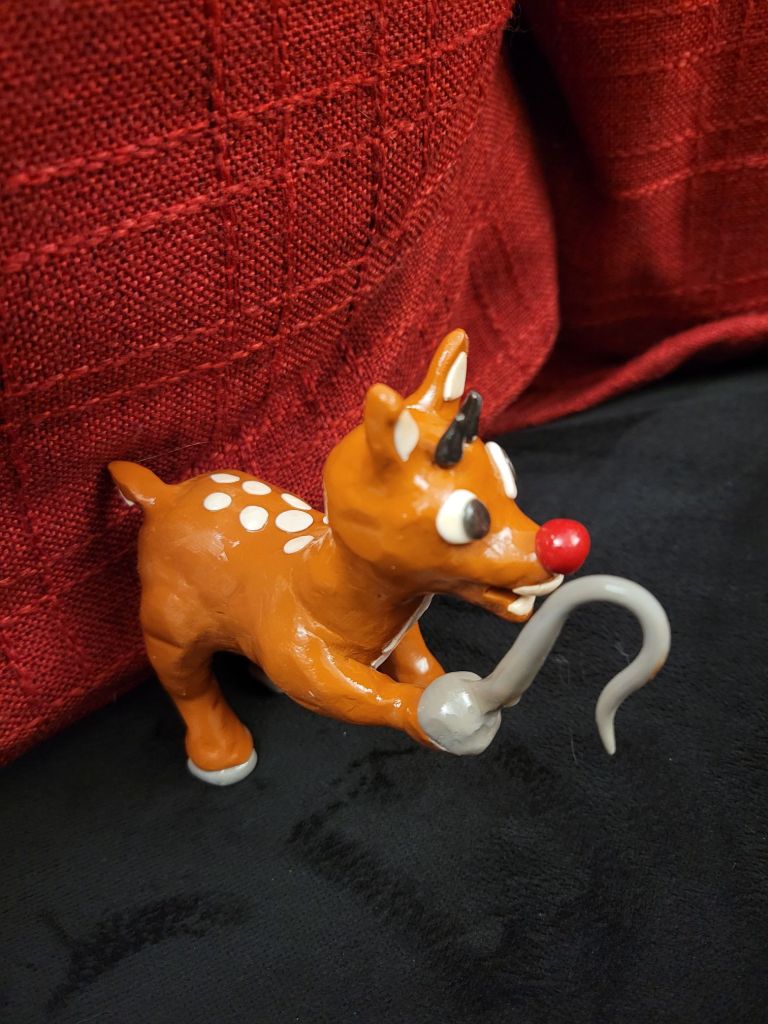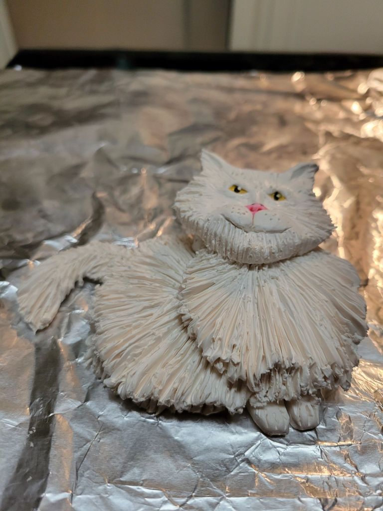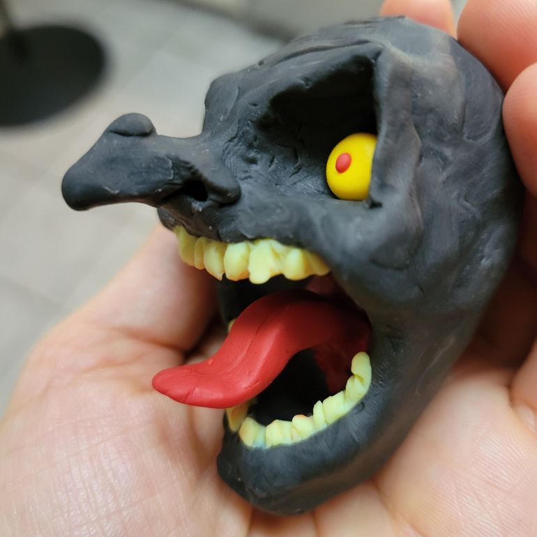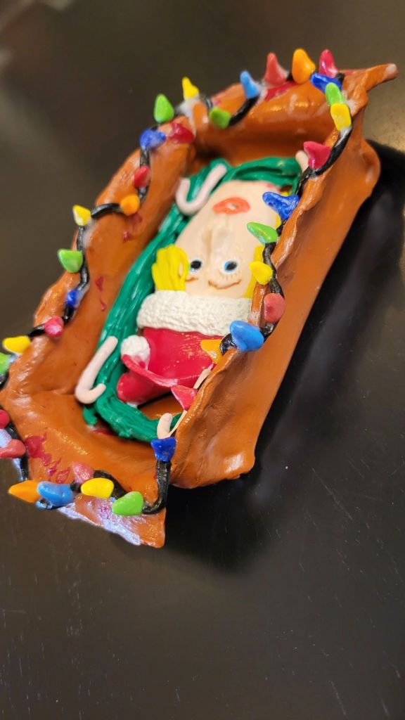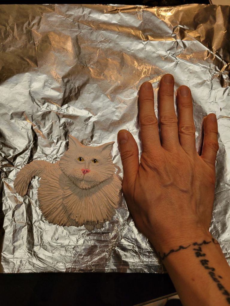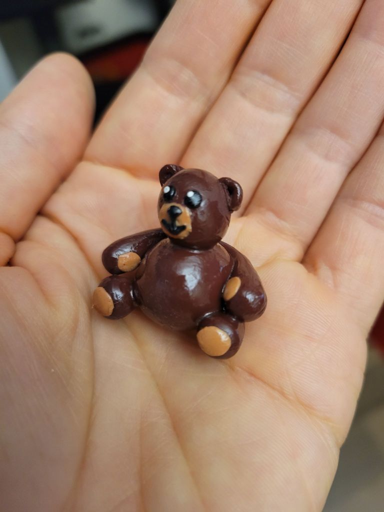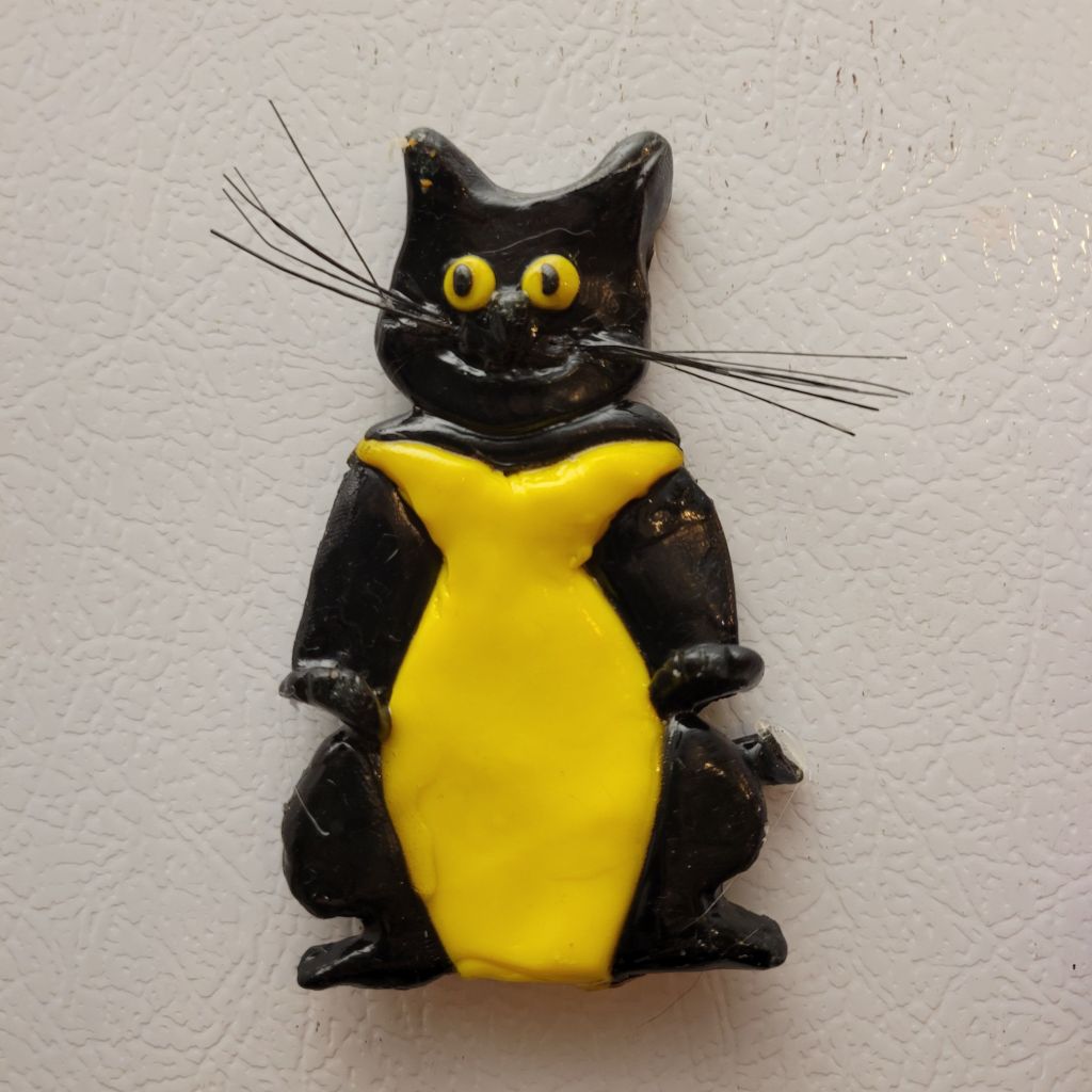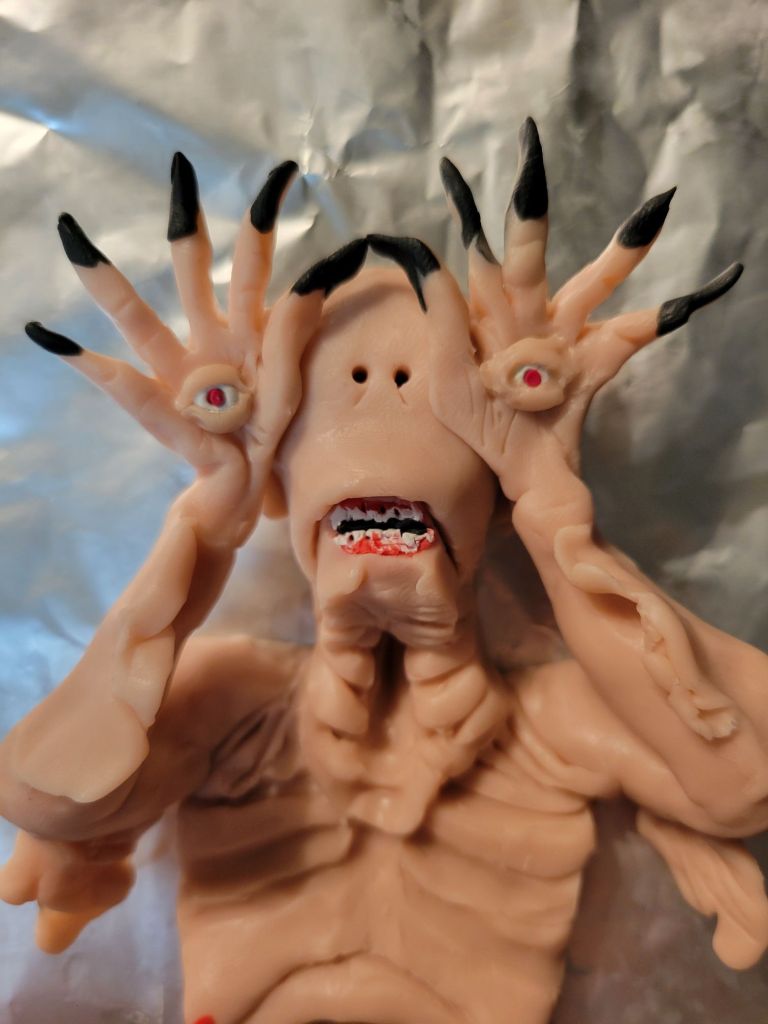 All sculptures were made by me with oven-bake polymer clay and sealed in a gloss or matte varnish. In some cases, I mounted them on my own acrylic-on-cardboard/unfinished wood paintings.