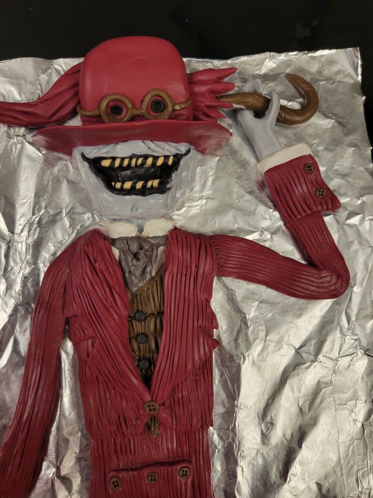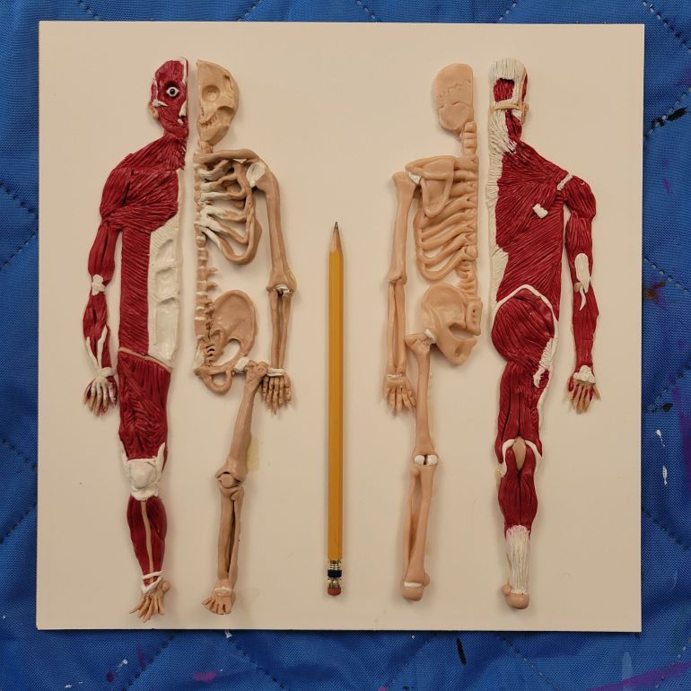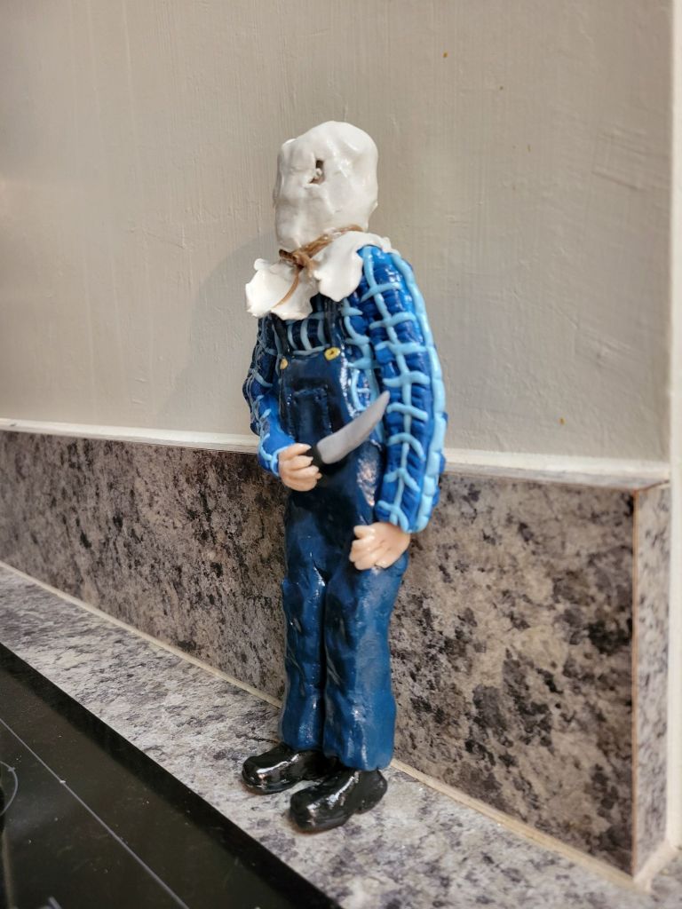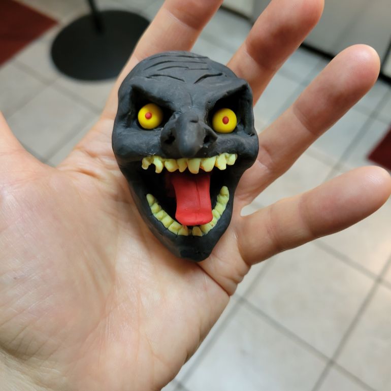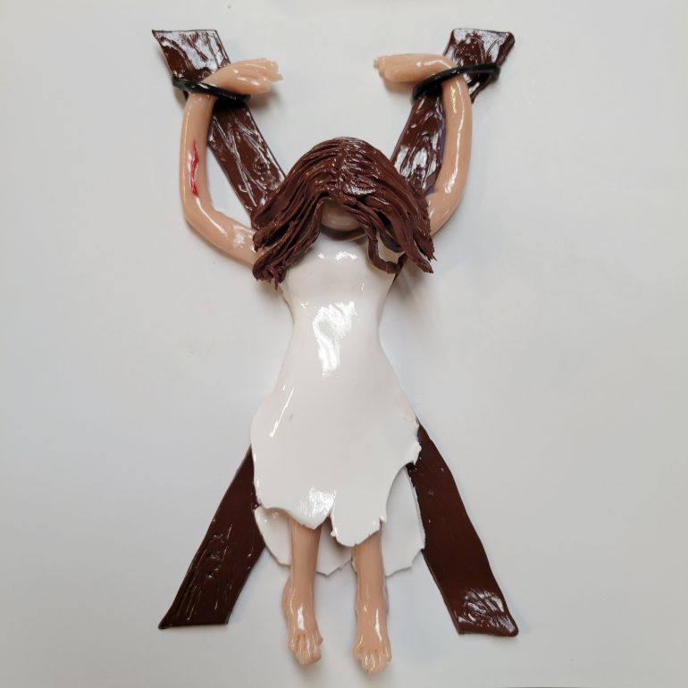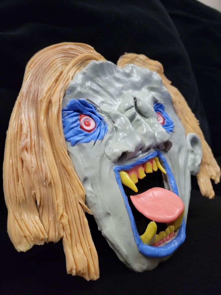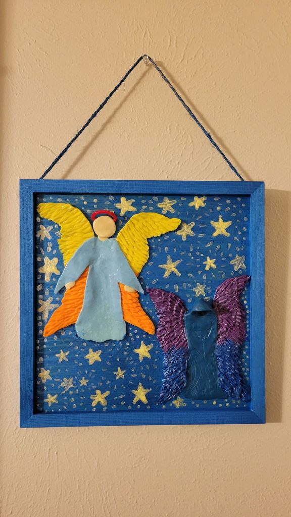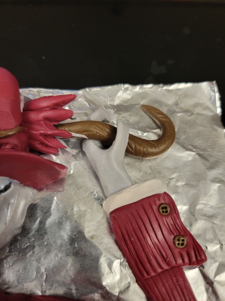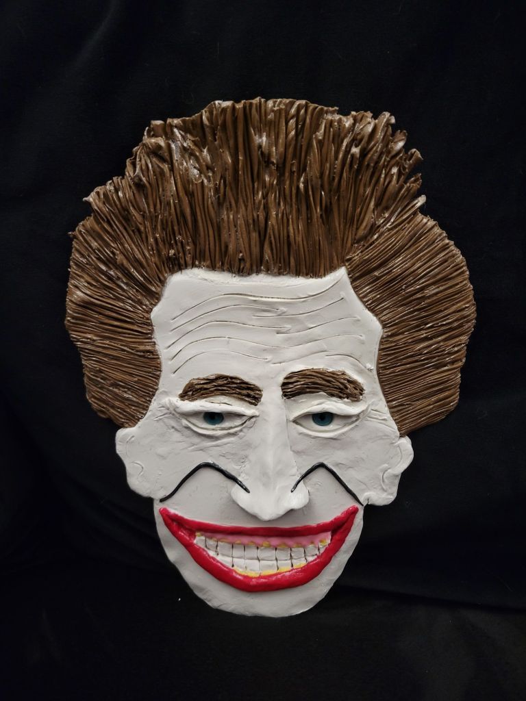 All sculptures were made by me with oven-bake polymer clay and sealed in a gloss or matte varnish. In some cases, I mounted them on my own acrylic-on-cardboard/unfinished wood paintings.