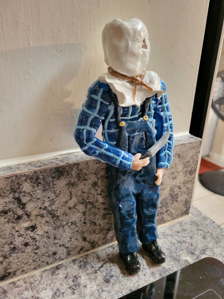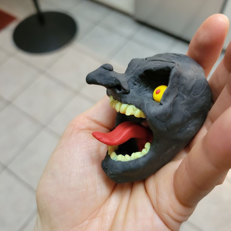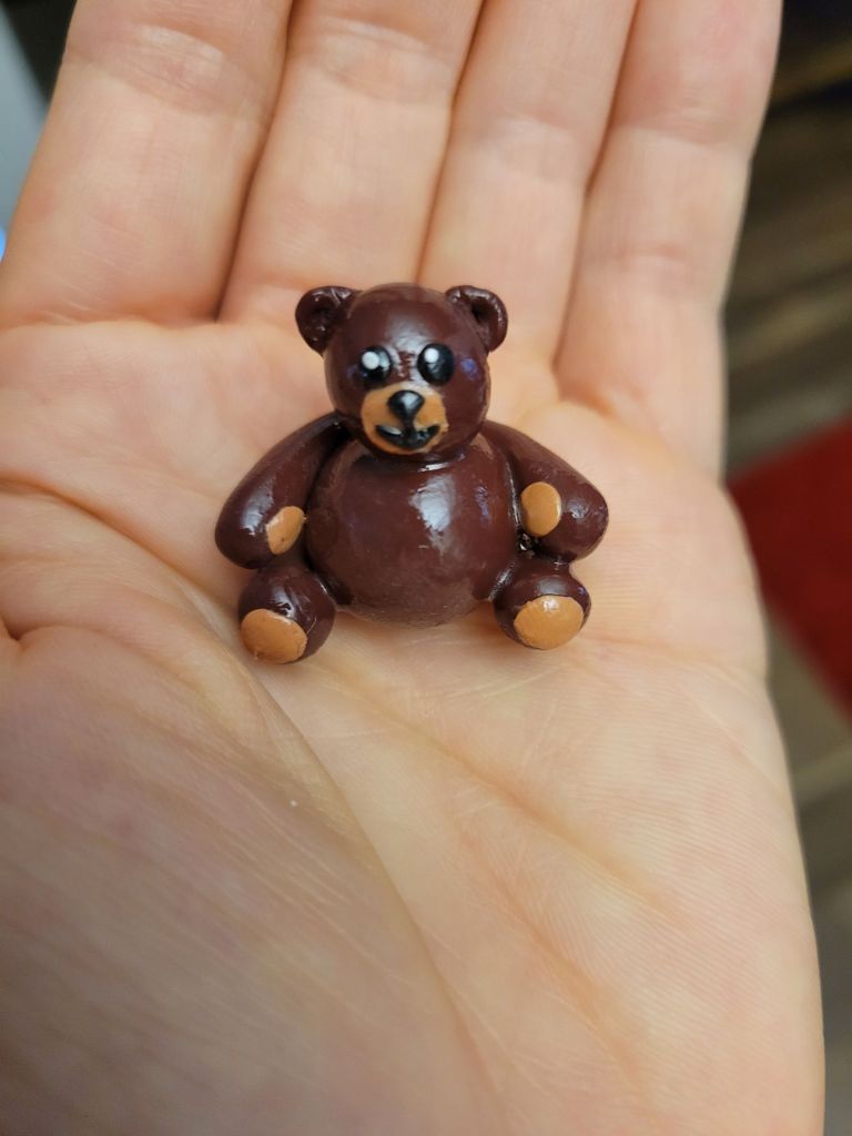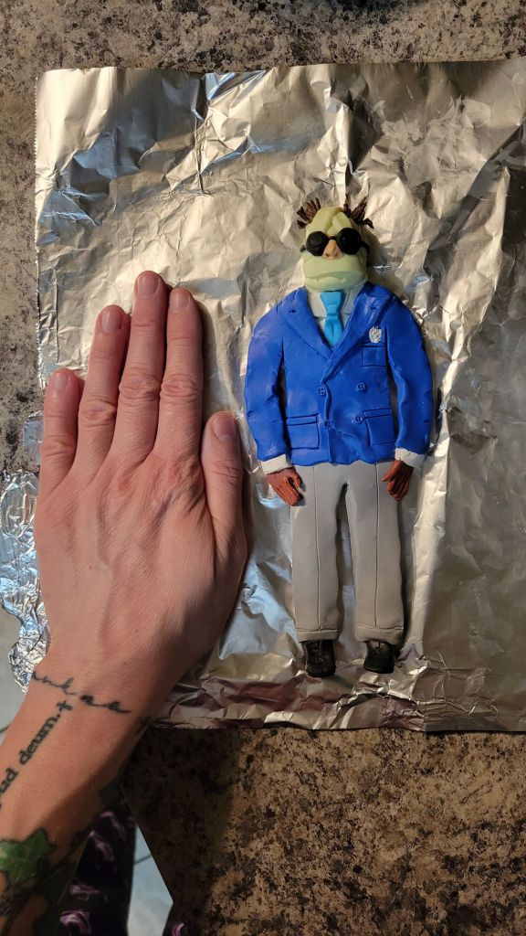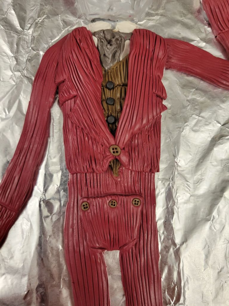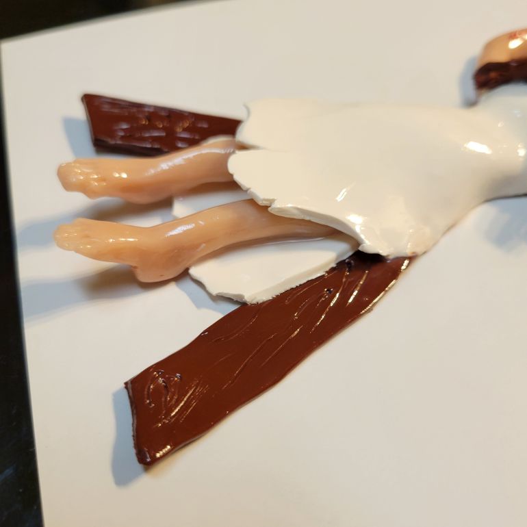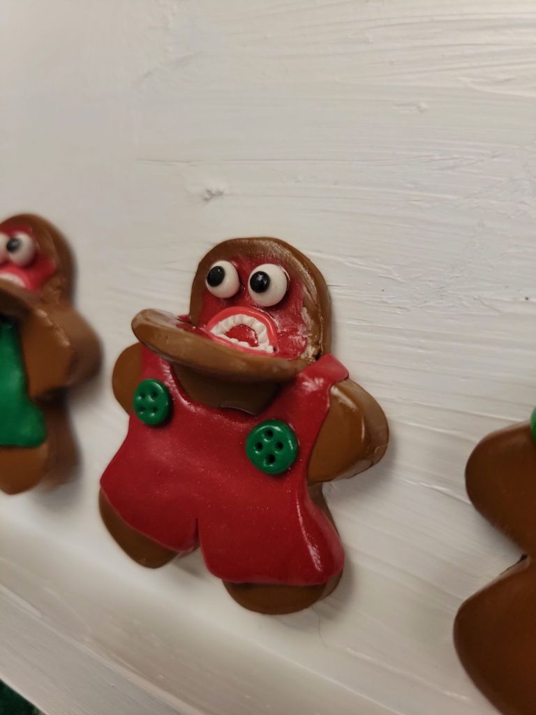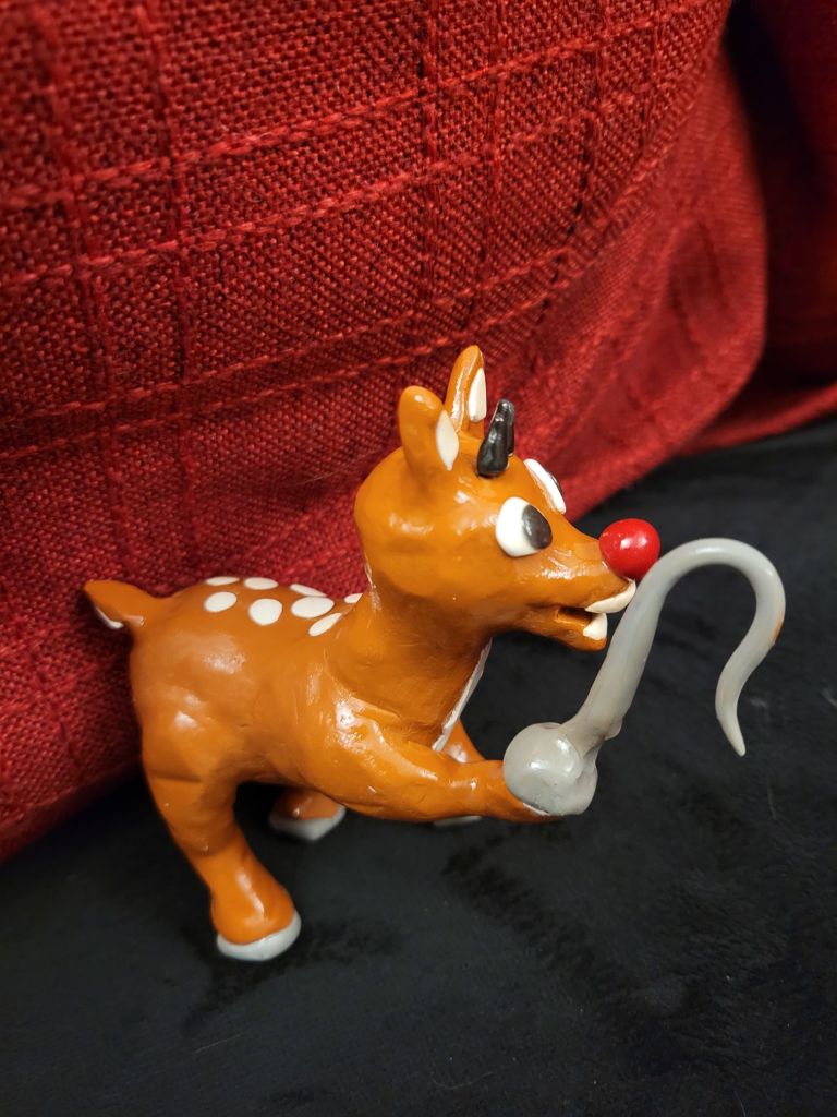 All sculptures were made by me with oven-bake polymer clay and sealed in a gloss or matte varnish. In some cases, I mounted them on my own acrylic-on-cardboard/unfinished wood paintings.